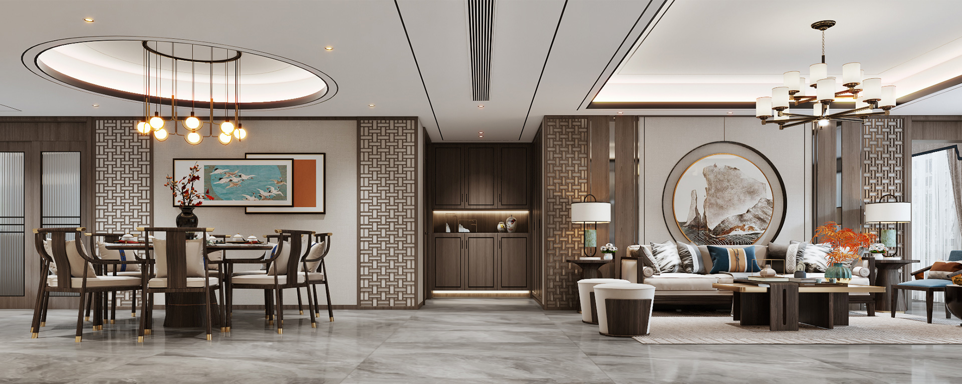 新中式風格是中式元素與現代材質的巧妙兼柔的布局風格,它同時明清家具、窗欞、布藝床品相互輝映,經典地再現了移步變景的精妙小品。